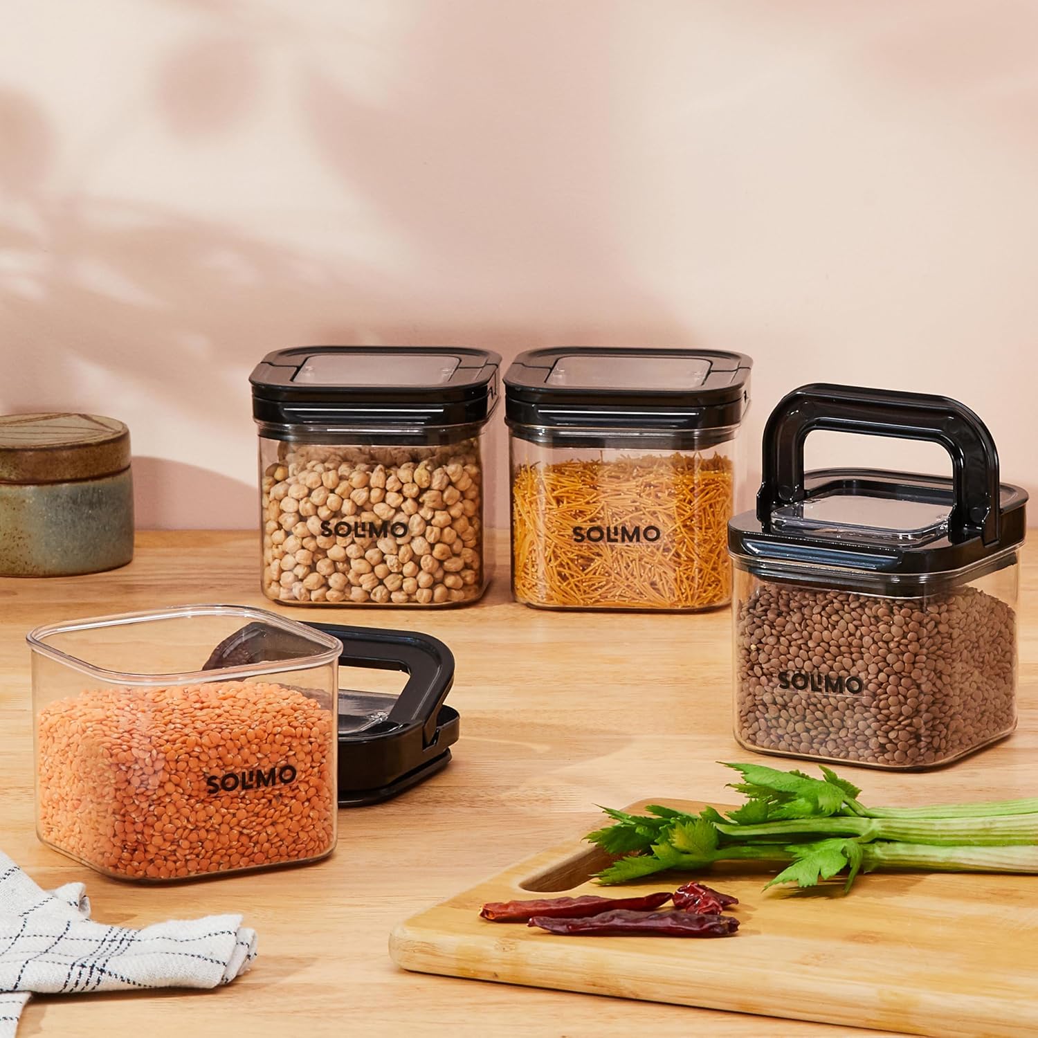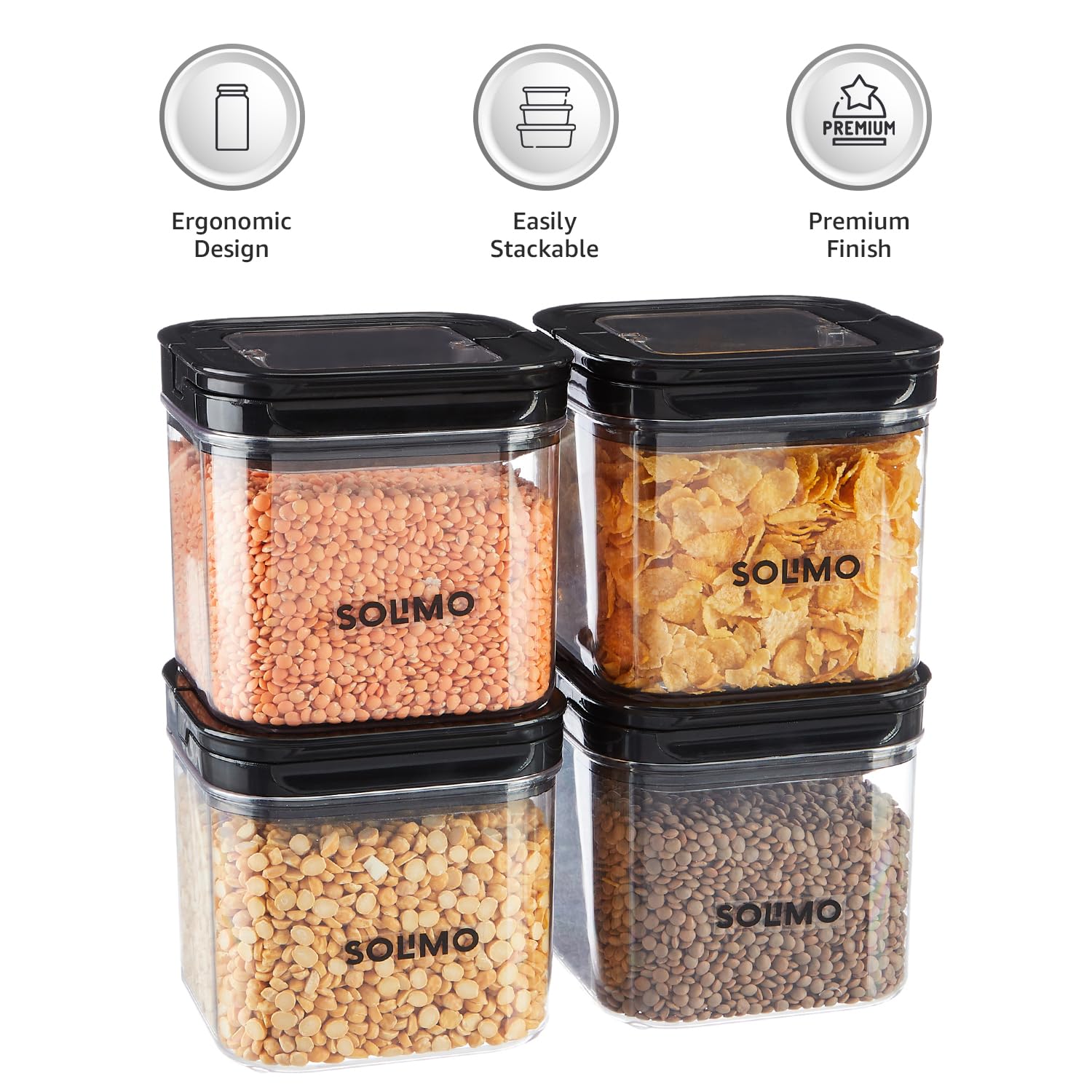 Solimo Airtight Plastic Storage Jar and Container Set-I | BPA Free | Multipurpose Storage | 750ml each, Set of 4 (Black)