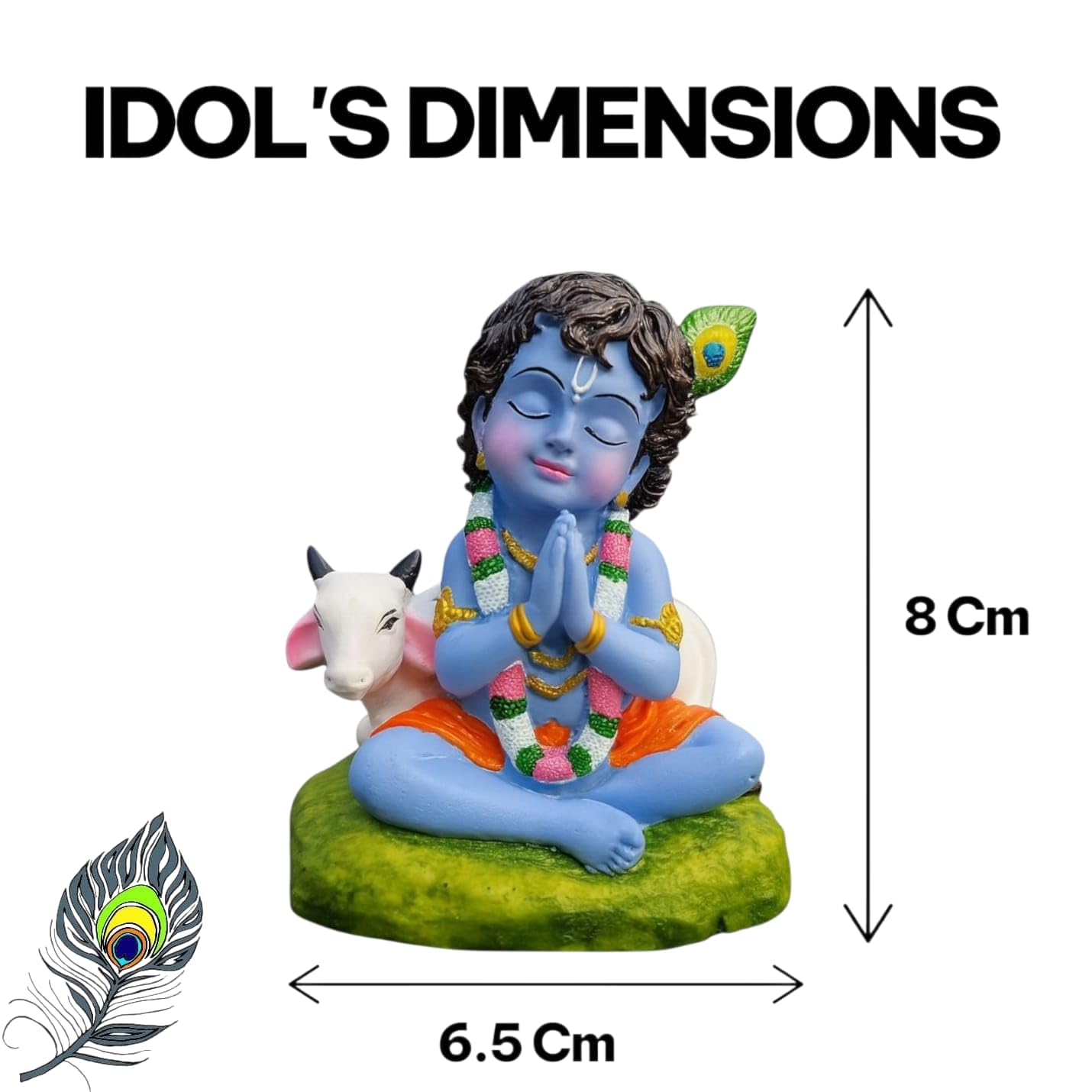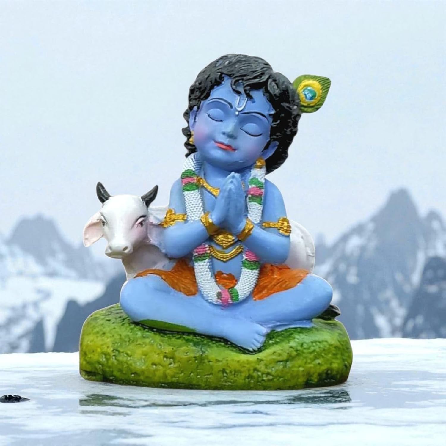 Bal Roop Lord Krishna Idol with Cow | Laddu Gopal Murti for Car Dashboard, Home Temple, Office Desk Decor | Resin Krishna Statue Showpiece – 8cm Height (Blue)