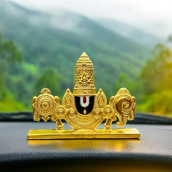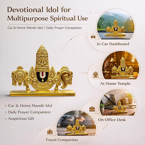 - Premium Divine Idol – Beautifully crafted Lord Venkateswara (Balaji/Tirupati) idol made of high-quality metal with a rich golden finish for a spiritual touch to your car or home.
